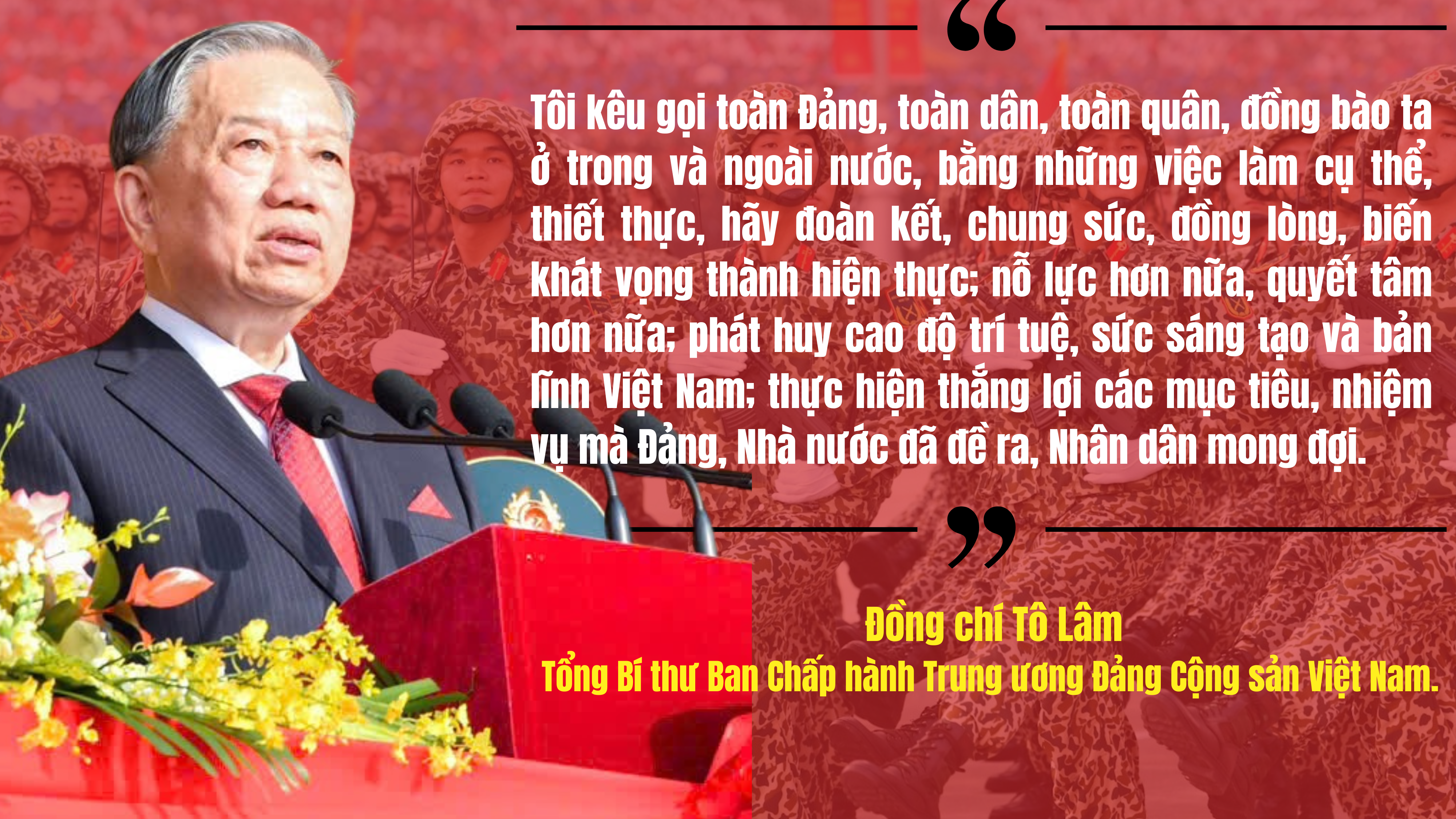Hướng tới tương lai, Đảng ta đặt mục tiêu đến năm 2045, kỷ niệm 100 năm thành lập nước, Việt Nam là quốc gia hùng cường, thịnh vượng, hạnh phúc. Đó là khát vọng của cả Dân tộc, là lời thề danh dự trước Lịch sử, trước Nhân dân. [Trích: Diễn văn Kỷ niệm 80 năm Cách mạng tháng Tám thành công (19/8/1945 - 19/8/2025) và Quốc khánh nước Cộng hòa xã hội chủ nghĩa Việt Nam (02/9/1945 - 02/9/2025)]