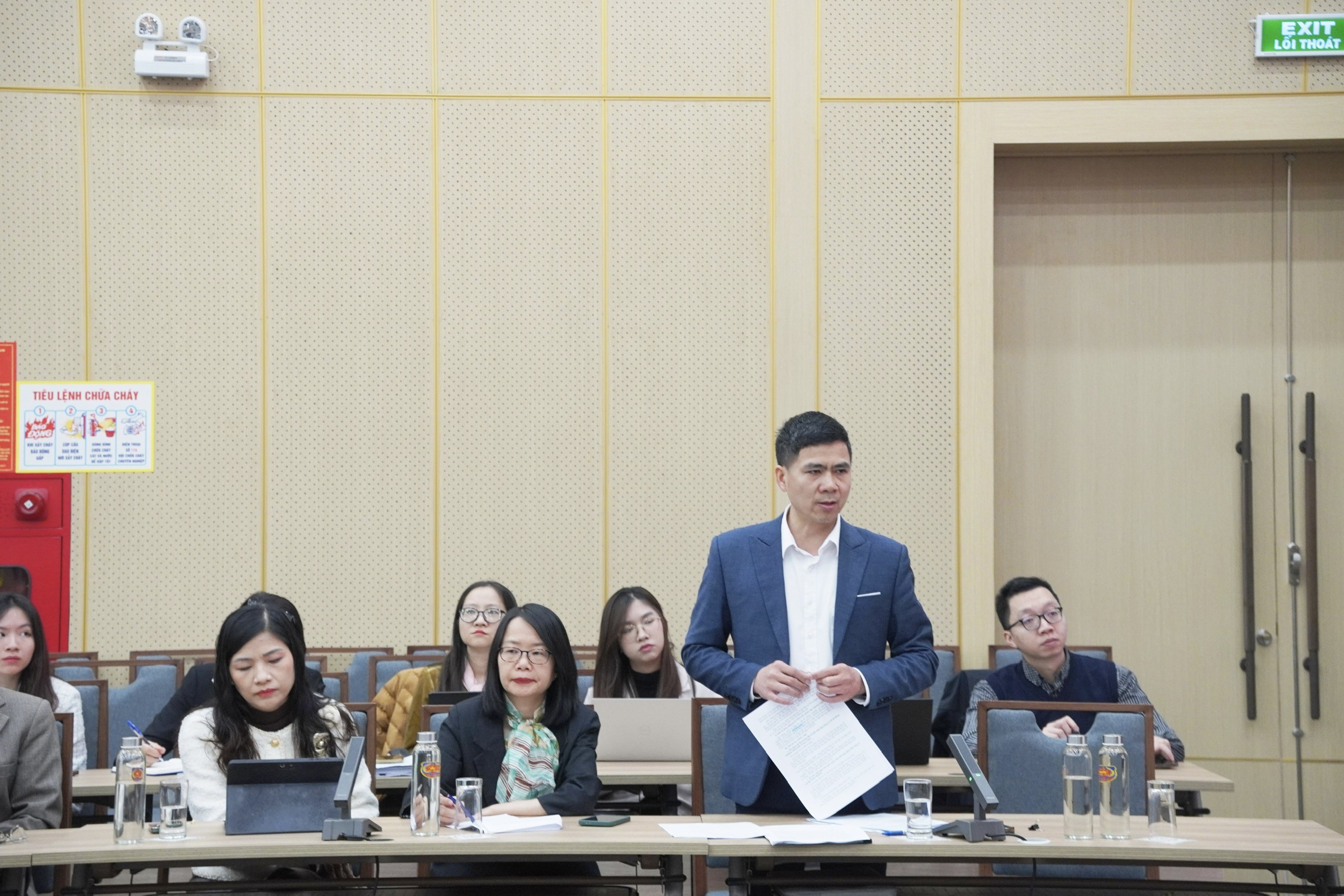 | Phó Chủ nhiệm Ủy ban Pháp luật và Tư pháp của Quốc hội Ngô Trung Thành trao đổi tại cuộc họp |