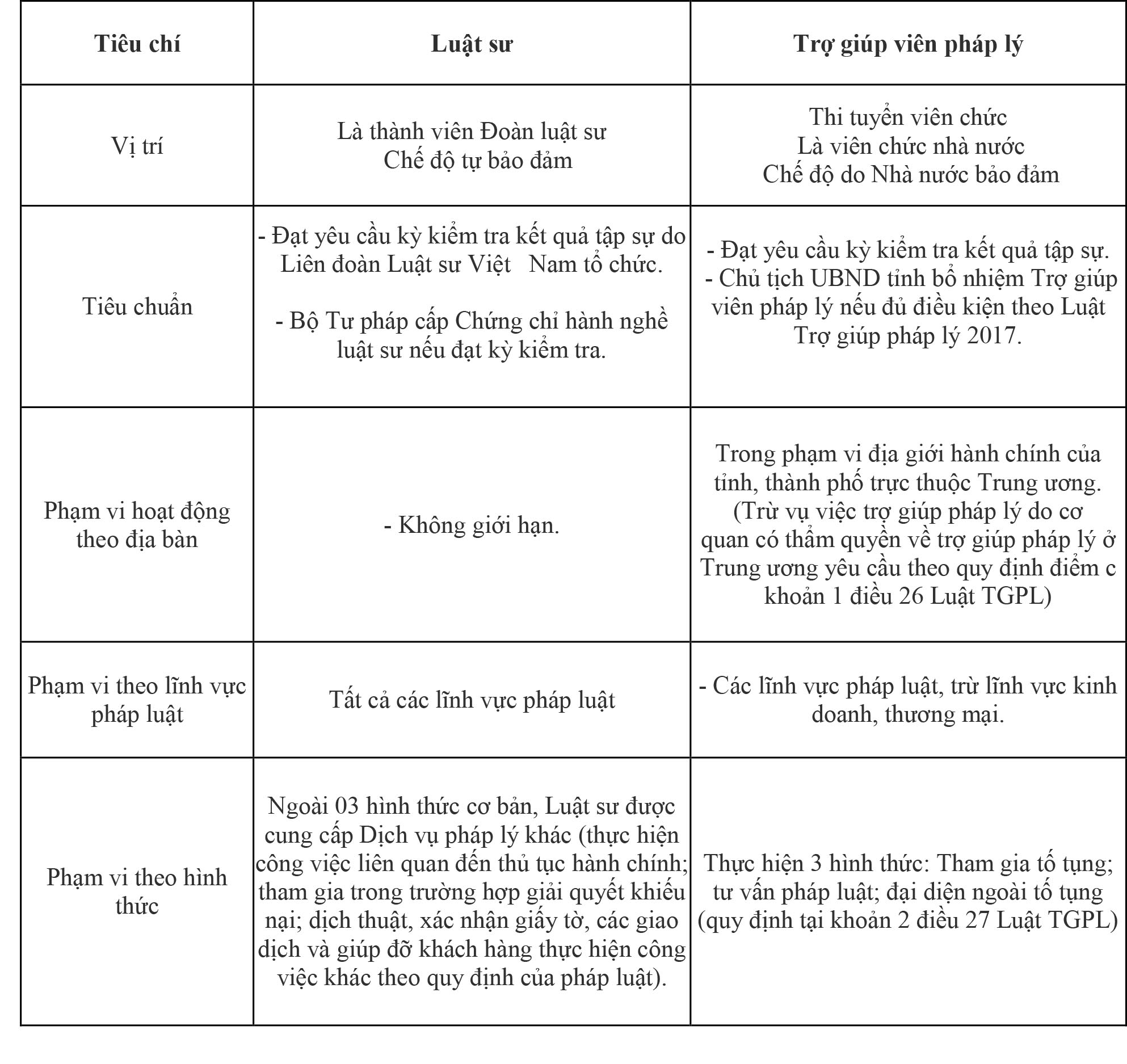 Có thể so sánh tiêu chuẩn của Luật sư và Trợ giúp viên pháp lý hiện nay theo các tiêu chuẩn quy định tại các văn bản pháp lý về luật sư hiện hành: